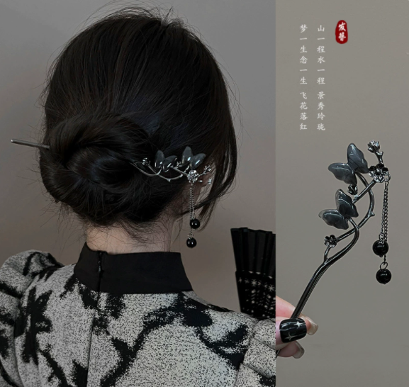 古风发饰女发簪高级感蝴蝶流苏吊坠黑色中式汉服簪子复古旗袍发钗